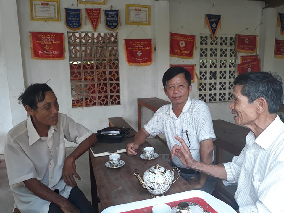 Ông Trần Hiếu Cơ, Phó Bí thư Đảng ủy, Chủ tịch UBND xã Phú Mậu (giữa) trò chuyện cùng người dân thôn Triêm Ân (cũ) tại nhà sinh hoạt cộng đồng chiều 13/4.