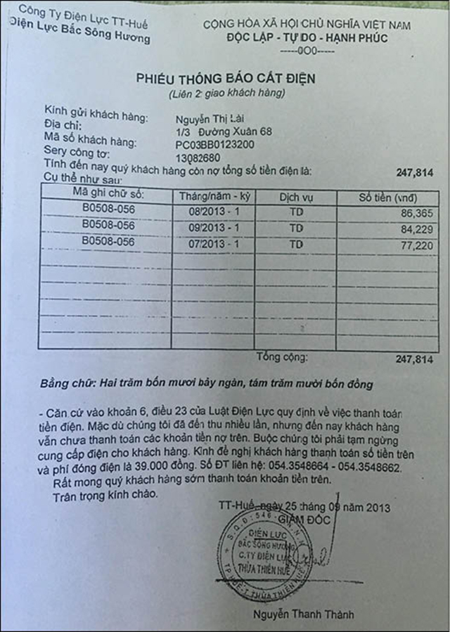Phiếu thông báo cắt điện của khách hàng Nguyễn Thị Lài (mẹ bà Hương) từ tháng 9/2013