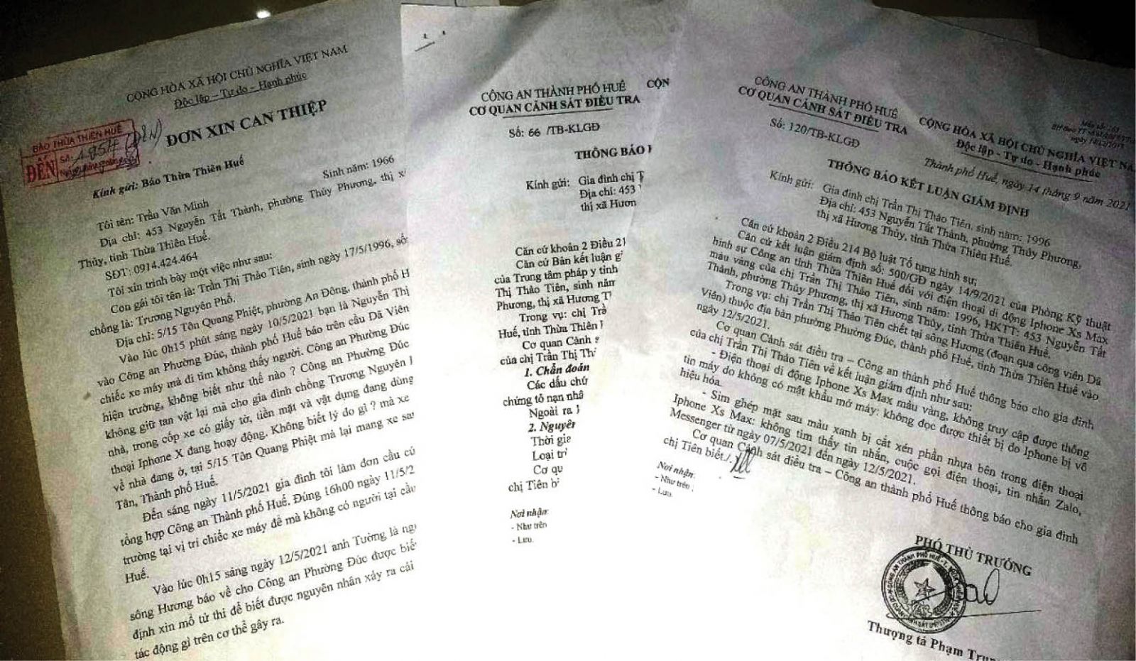 Sáng 11/5/2021, gia đình ông Trần Văn Minh làm đơn đến Đội Điều tra tổng hợp Công an TP. Huế cầu cứu. 16 giờ chiều 11/5/2021, công an ra dựng lại hiện trường tại vị trí chiếc xe máy ở cầu Dã Viên. Vào lúc 0 giờ 15 phút sáng 12/5/2021, một người tên Tường - đi ghe làm cá trên sông Hương báo về Công an phường Phường Đúc phát hiện con gái ông Trần Văn Minh chết. Gia đình ông Trần Văn Minh xin mổ tử thi để biết được nguyên nhân xảy ra cái chết và chết do những tác động gì trên cơ thể.