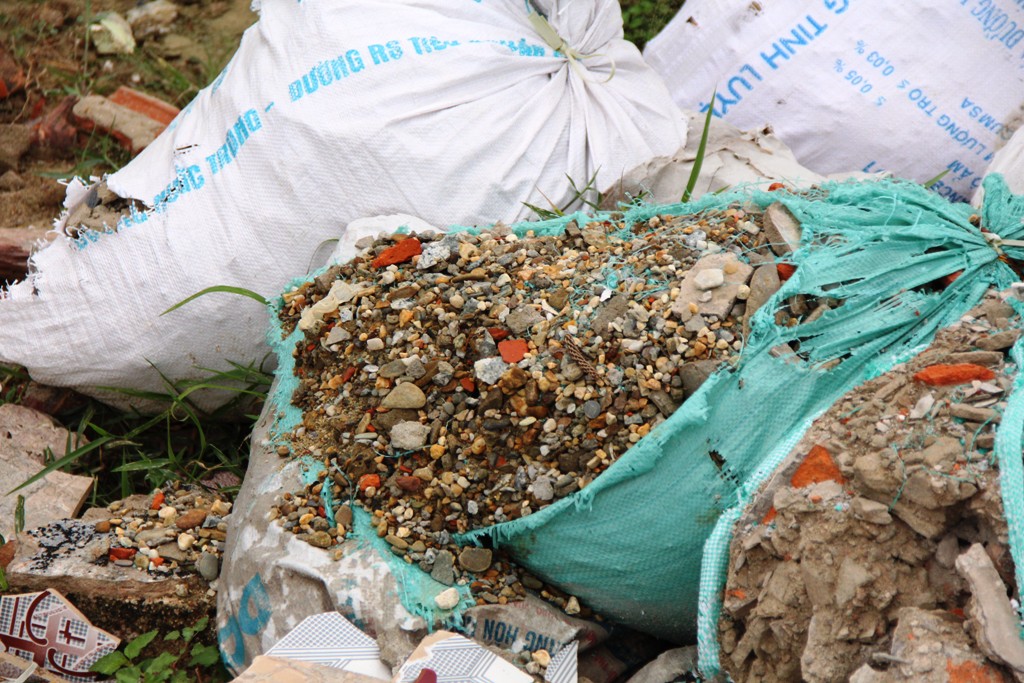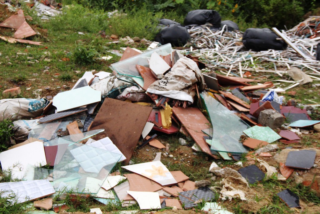 Ngoài đất đá, những loại rác liên quan như gương kính, gạch men vỡ vụn cũng được đổ trộm một cách lén lút