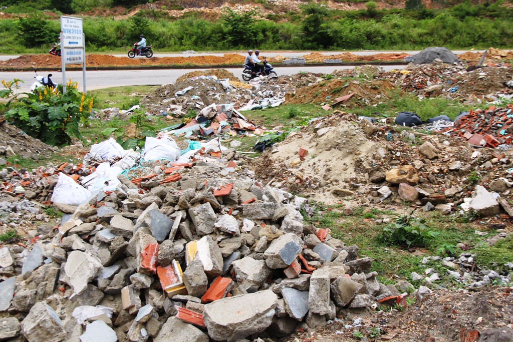Theo phản ánh của người dân, chúng tôi tìm về khu vực này và chứng kiến cảnh nham nhở, nhếch nhác chẳng khác gì một bãi rác thật sự. Những khu vực đất trống ngập tràn rác thải xây dựng đủ kiểu từ đất đá, vôi vữa, gạch men, đồ điện, cây cảnh... chất thành từng đống cao hơn cả mét, thậm chí còn đổ lấn ra đường gây tiềm ẩn tai nạn giao thông cho người đi đường.