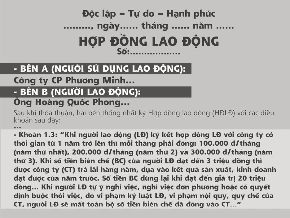 Tìm hiểu chúng tôi được biết, tại hợp đồng lao động và phụ lục hợp đồng lao động đã ký kết giữa ông Phong và Công ty CP Phương Minh đã nêu rõ các điều kiện ràng buộc giữa 2 bên. Trong đó, tại khoản 1.3, Phụ lục hợp đồng lao động nêu: “Khi người lao động ký kết hợp đồng lao động với công ty có thời gian từ 1 năm trở lên thì mỗi tháng phải đóng: 100 ngàn đồng/tháng (năm thứ nhất), 200 ngàn đồng/tháng (năm thứ 2) và 300 ngàn đồng/tháng (năm thứ 3). Khi số tiền biên chế của người lao động đạt đến 3 triệu đồng thì được công ty trả lãi hàng năm, dựa vào kết quả sản xuất, kinh doanh đạt được của năm trước. Số tiền biên chế dừng lại khi đạt đến giá trị 20 triệu đồng… Khi người lao động tự ý nghỉ việc, nghỉ việc đơn phương hoặc có quyết định buộc thôi việc, do vi phạm kỷ luật lao động, vi phạm nội quy, quy chế của công ty, người lao động sẽ mất toàn bộ số tiền biên chế đã đóng vào công ty…”.