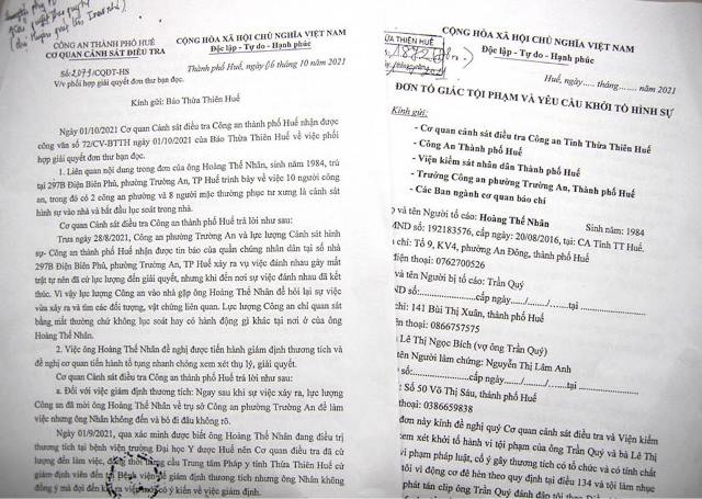 Nội dung đơn của ông Hoàng Thế Nhân gửi đến Báo Thừa Thiên Huế viết: Khoảng 10 giờ 5 phút ngày 28/8/2021, trong lúc tôi đang ở nhà trọ tại địa chỉ 297B Điện Biên Phủ, phường Trường An (TP. Huế) với bạn gái là N. T. L. A., trú tại TP. Huế, thì đột nhiên vợ chồng ông Trần Quý và một số người tông cửa xông vào, đánh đập dữ dội và liên tục khiến tôi không thể phản ứng được. Trong khi đó, những người đi cùng đã ngăn cản không cho người thân của tôi vào can thiệp. Khi em tôi nói sẽ gọi công an thì ông Trần Quý còn lớn tiếng thách thức.