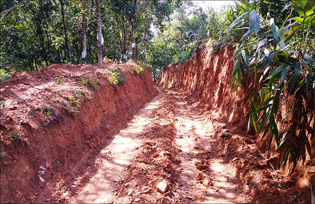 Tại con đường lâm sinh này - điểm sát khu vực rừng kinh tế của ông Lê Ngọc Quyền, nhiều ngày nay, ông Quyền cho máy xúc nạo đất, hạ thấp độ cao từ 2-3m so với mặt đường cũ, trên chiều dài gần 150m. Việc hạ độ cao mặt đường đã ăn sát vào rừng cây cao su của các hộ dân nằm bên cạnh, một số điểm cây cao su bị xói lở cả rễ.
