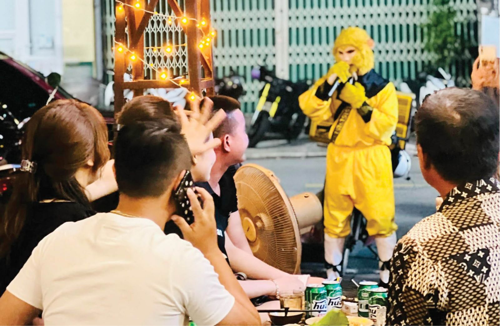 Hát ca khúc này đến ca khúc khác, mọi người thay nhau hát, không khí trở nên náo nhiệt. Hết “đắp mộ cuộc tình”, đến “gánh mẹ”, “lên mái nhà bắt con gà”… lần lượt những “giai điệu quen thuộc” trong giới karaoke di động được các “giọng ca” cất lên từ lúc cuộc nhậu bắt đầu cho đến khi ngà ngà say… Thi thoảng, giữa những khoảng hát đó là những cú hét khiến nhiều người ở nhà cạnh bên giật mình.