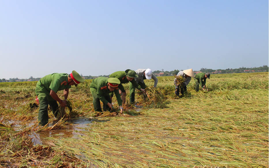 Lực lượng Công an huyện Phong Điền giúp dân gặt lúa gãy đổ
