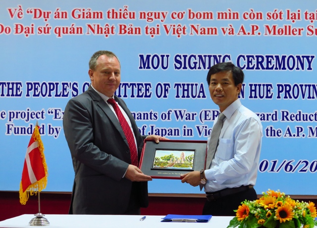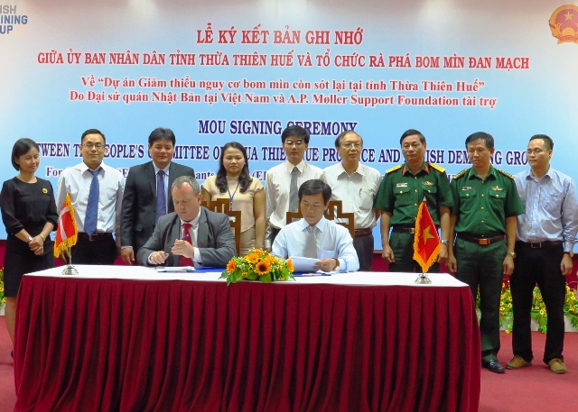 HNN.VN - Sáng 1/6, UBND tỉnh và Tổ chức rà phá bom mìn Đan Mạch (DDG) Việt Nam tổ chức lễ ký biên bản ghi nhớ về dự án “Giảm thiểu nguy cơ bom mìn còn sót lại tại tỉnh Thừa Thiên Huế” do Đại sứ quán Nhật Bản và Quỹ A.P. Møller Support Foundation (Đan Mạch) tài trợ.
