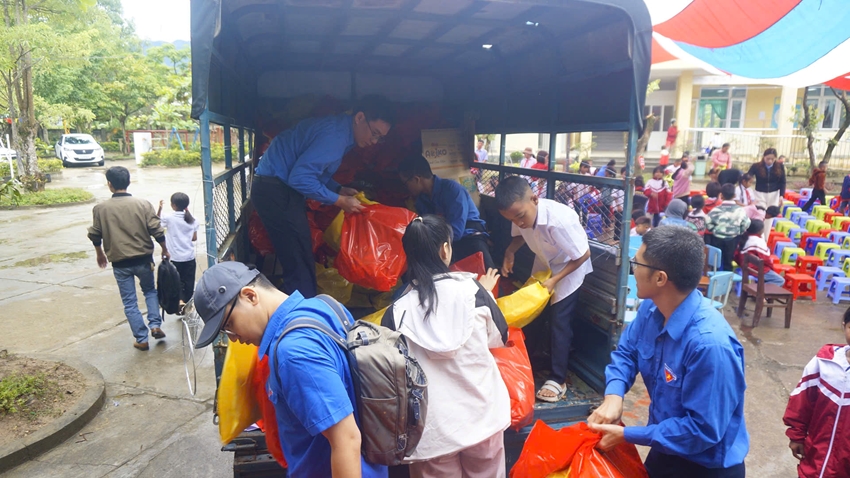 | Chi đoàn Báo Thừa Thiên Huế cùng các đơn vị tài trợ, nhà hảo tâm vận chuyển các phần quà đến Trường tiểu học Hồng Vân |