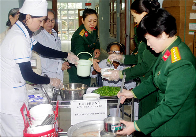 Gần 10 giờ sáng thứ bảy, tại Khoa Nội chung (Bệnh viện Quân y 268), hàng chục bệnh nhân, người nhà bệnh nhân quây quanh nồi cháo của Hội Phụ nữ cơ sở Bệnh viện Quân y 268 để nhận "Bát cháo tình thương" dành cho các bệnh nhân nặng, bệnh nhân sau phẫu thuật, bệnh nhân là người già, hộ nghèo, gia đình chính sách...Các chị em hội viên phụ nữ của bệnh viện vừa tất bật múc cháo vừa niềm nở, thân tình hỏi thăm sức khỏe từng người.