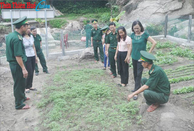 Thiếu tá Phạm Quang Thắng (ngồi) hướng dẫn đoàn công tác Bộ Chỉ huy Biên phòng tỉnh và Hội LHPN tỉnh tham quan vườn rau tăng gia trên đảo