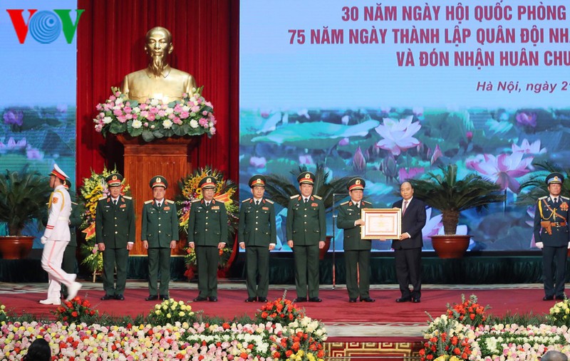 Thủ tướng Nguyễn Xuân Phúc trao tặng Huân chương Quân công hạng Nhất cho Bộ Quốc phòng tại Lễ kỷ niệm 75 năm ngày thành lập QĐND Việt Nam. (Ảnh: Trọng Phú)