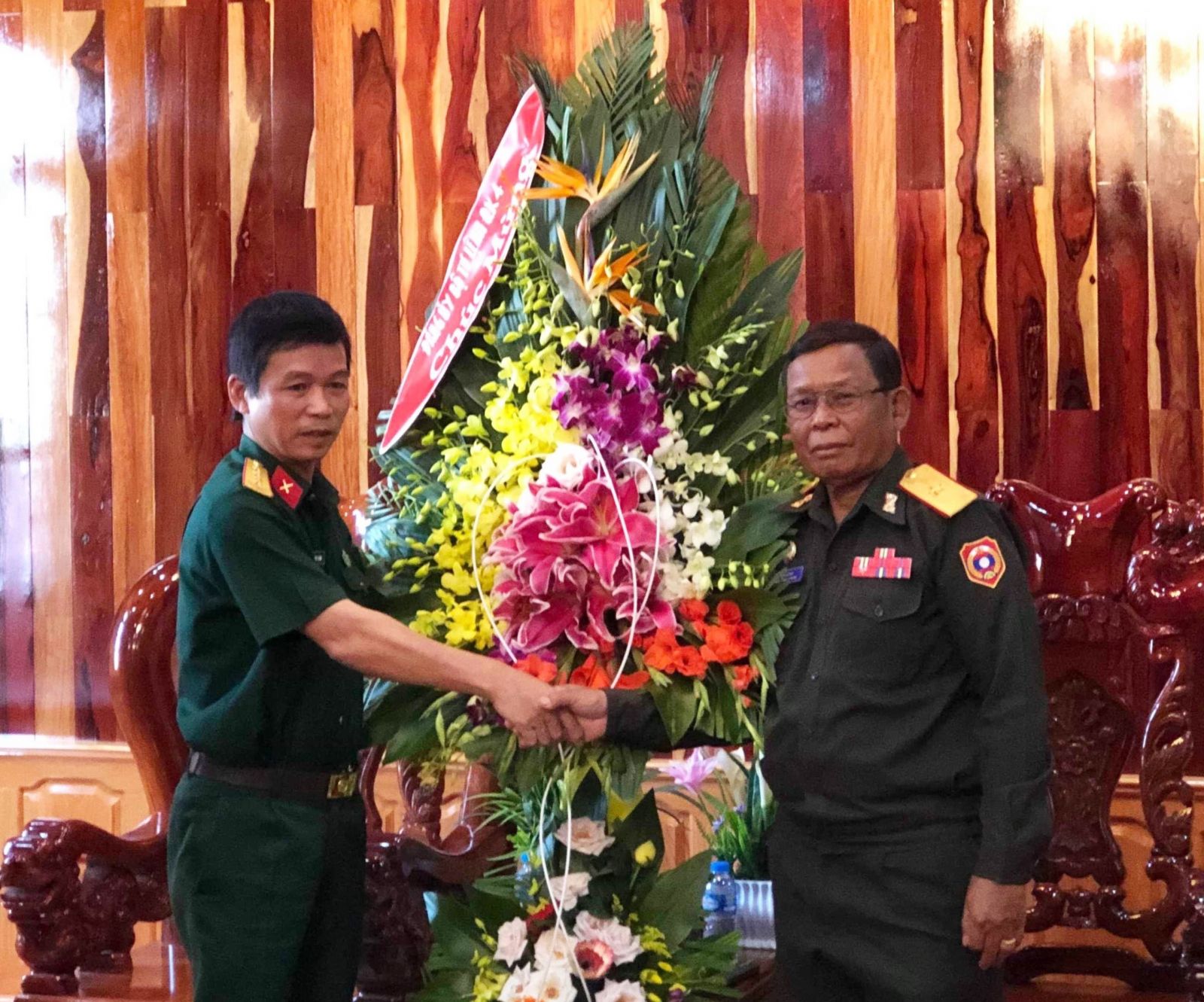 Đại tá Nguyễn Ngọc Lâm (bên phải) chúc mừng Bộ CHQS tỉnh Sê kông