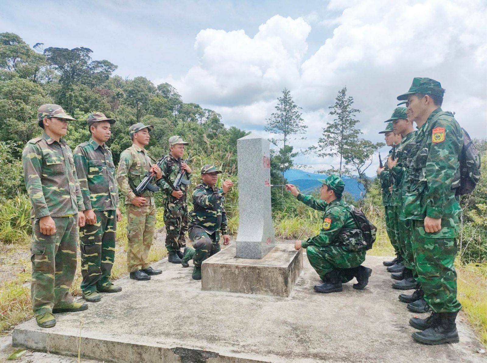 Cùng sơn lại số hiệu cột mốc trong chuyến tuần tra song phương