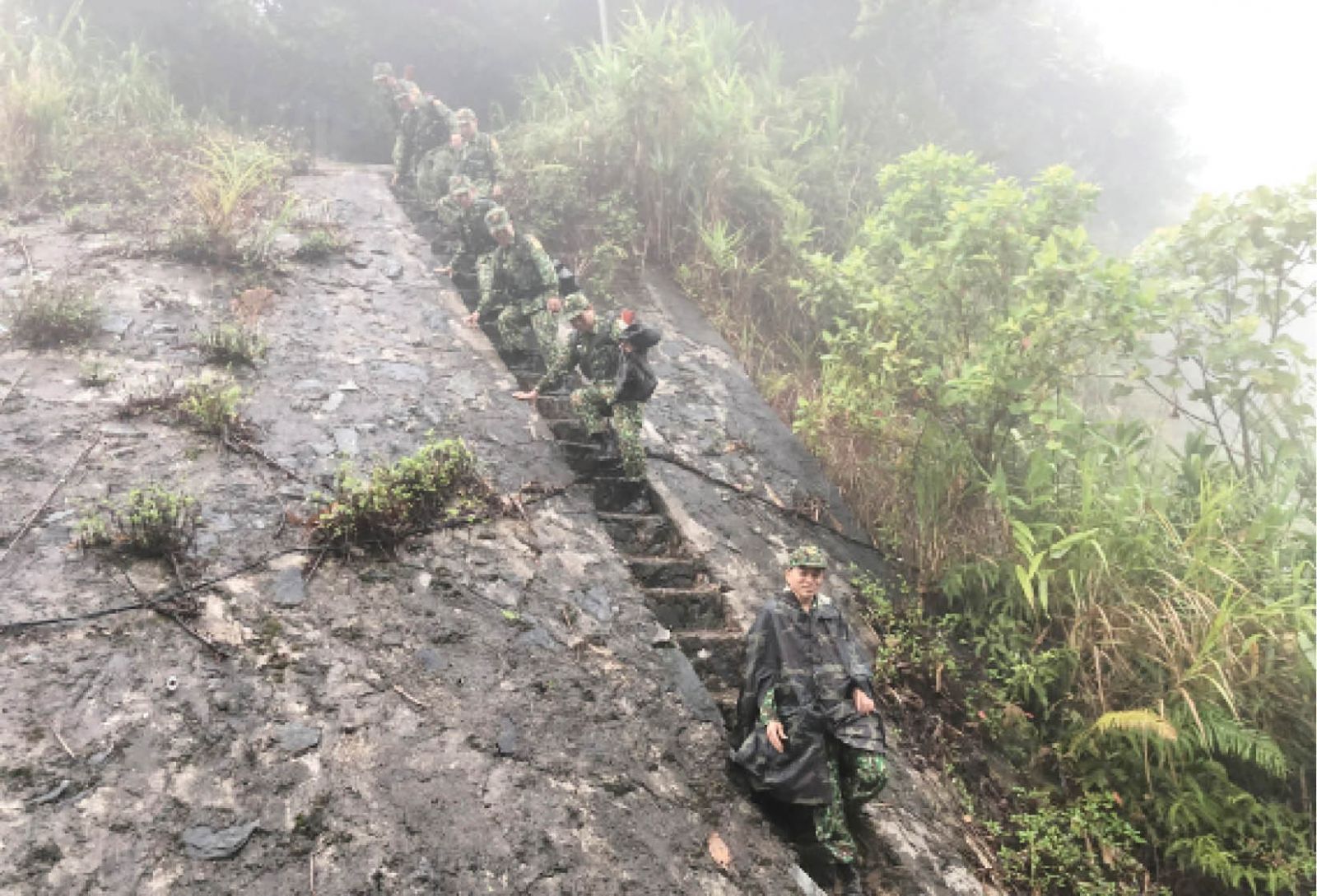 Sau cái bắt tay thật chặt và những nụ cười cởi mở, thân thiện trao nhau, BĐBP Đồn BPCK Hồng Vân và lực lượng Đại đội Bảo vệ biên giới 511 cùng nhau băng rừng, vượt qua những con dốc gần như dựng đứng, tuần tra đến cột mốc 648 giữa đỉnh rừng.