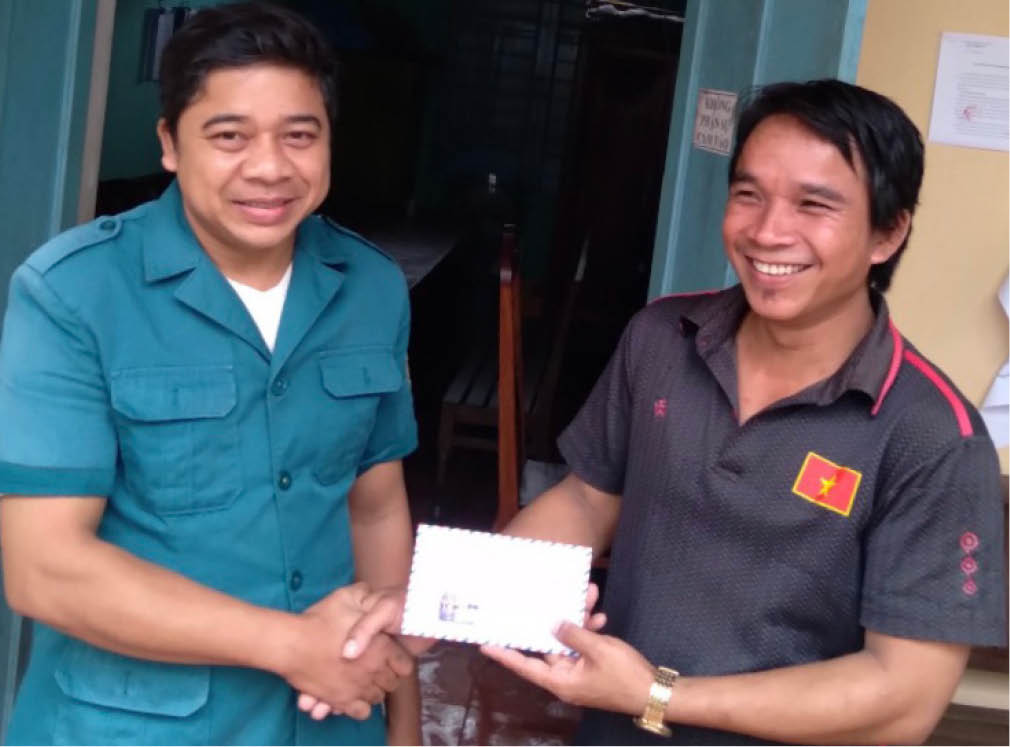 Anh Nguyễn Hồng Khởi (bên trái) thăm, động viên gia đình thiệt hại do bão số 13