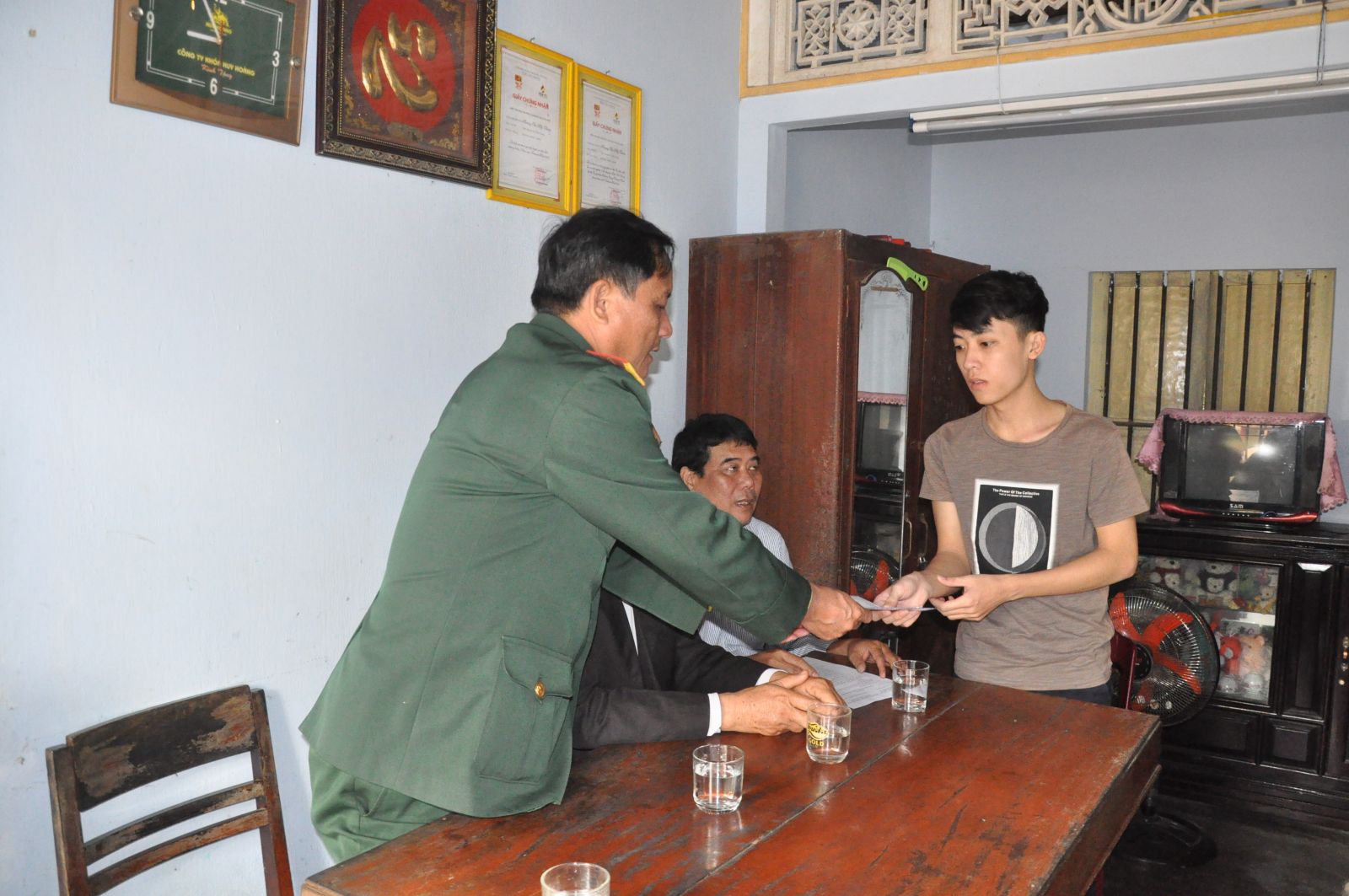 Đại diện BCH Quân sự thị xã Hương Trà thăm, tặng quà cho thanh niên Trần Bá Hoài ở Hương Vân