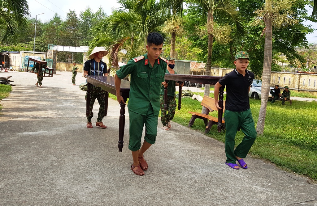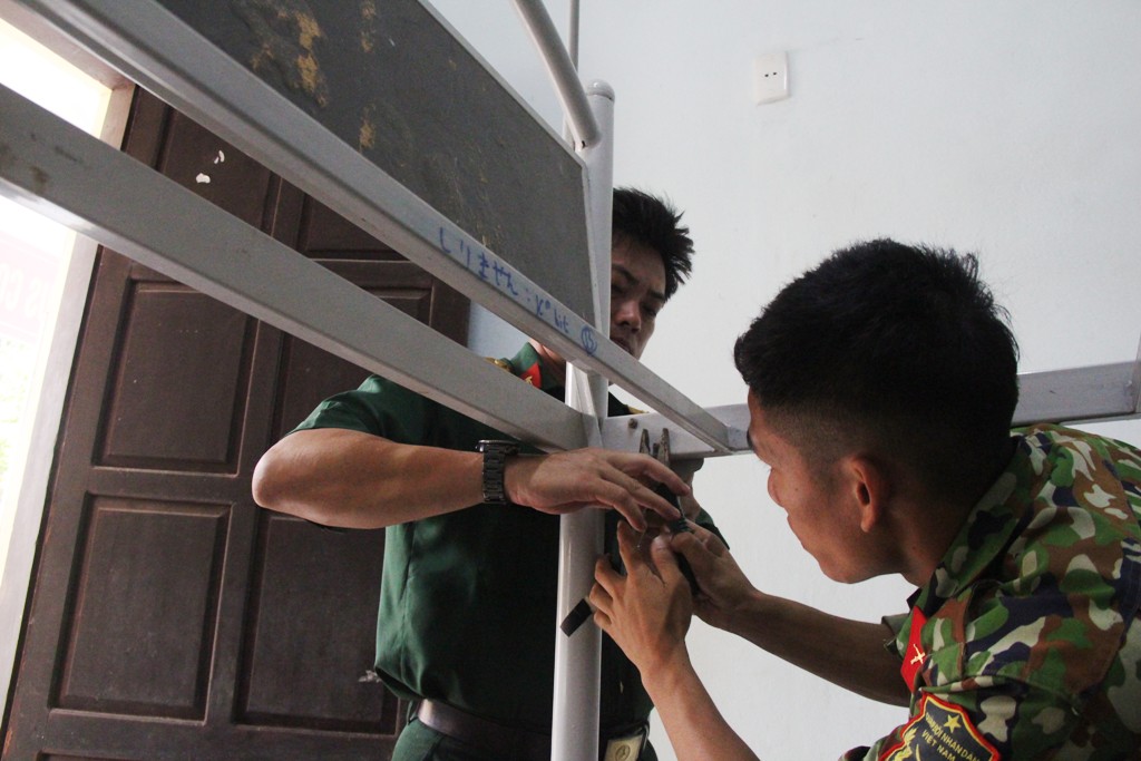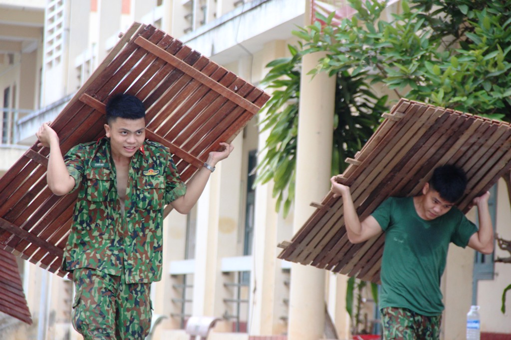 Những chiếc giường di động chuyển từ khu này sang khu khác được tháo đi để đưa về lại nơi cũ. Dưới cái nắng oi của buổi chiều đầu hạ, các chiến sĩ theo sự phân công của cấp trên miệt mài di chuyển từng khung giường, ván giường và các vật dụng liên quan trả lại đúng vị trí ban đầu.