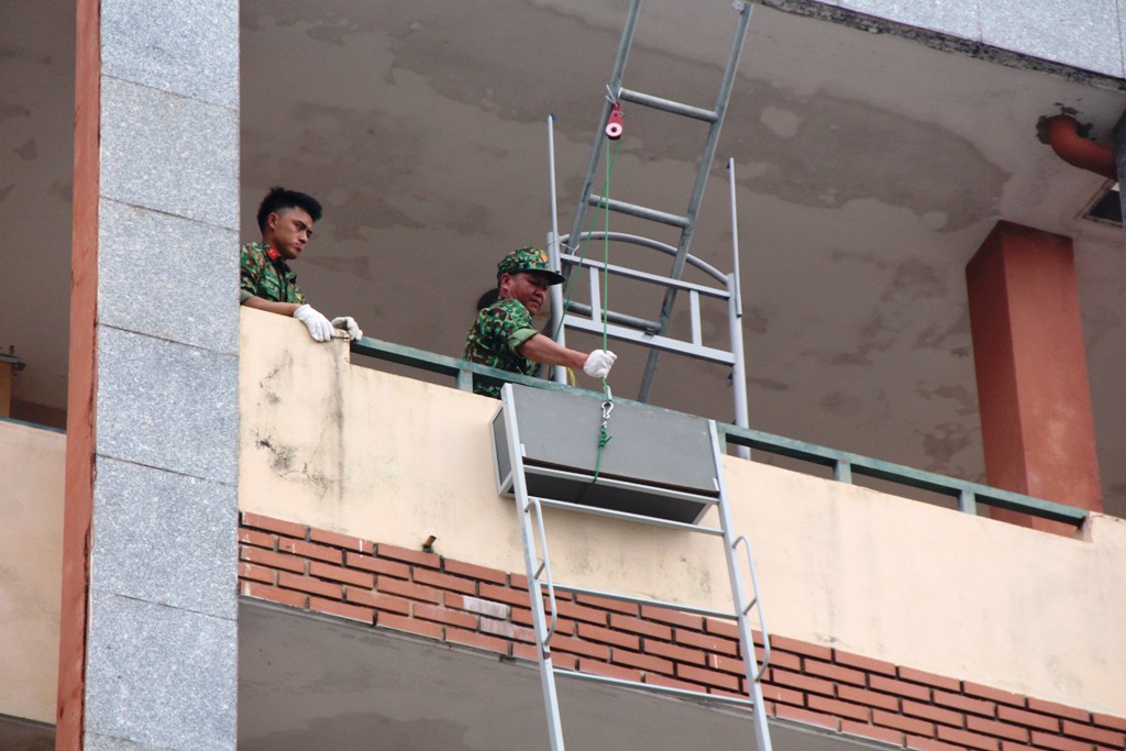 Những khung giường được di chuyển lên các tòa nhà cao tầng, khi hết cách ly các chiếc giường ấy được các chiến sĩ tháo dỡ và đưa xuống theo ròng rọc