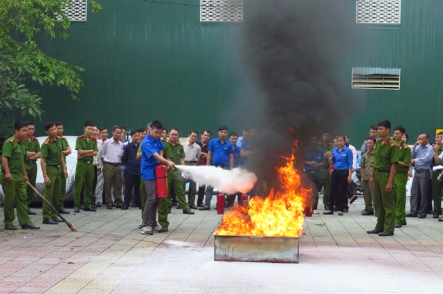 | Tiến hành thực hành dập tắt đám cháy bằng bình bọt chữa cháy |