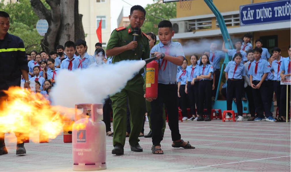 Trung uý Lê Viết Quốc Vũ hướng dẫn kỹ năng chữa cháy cho học sinh