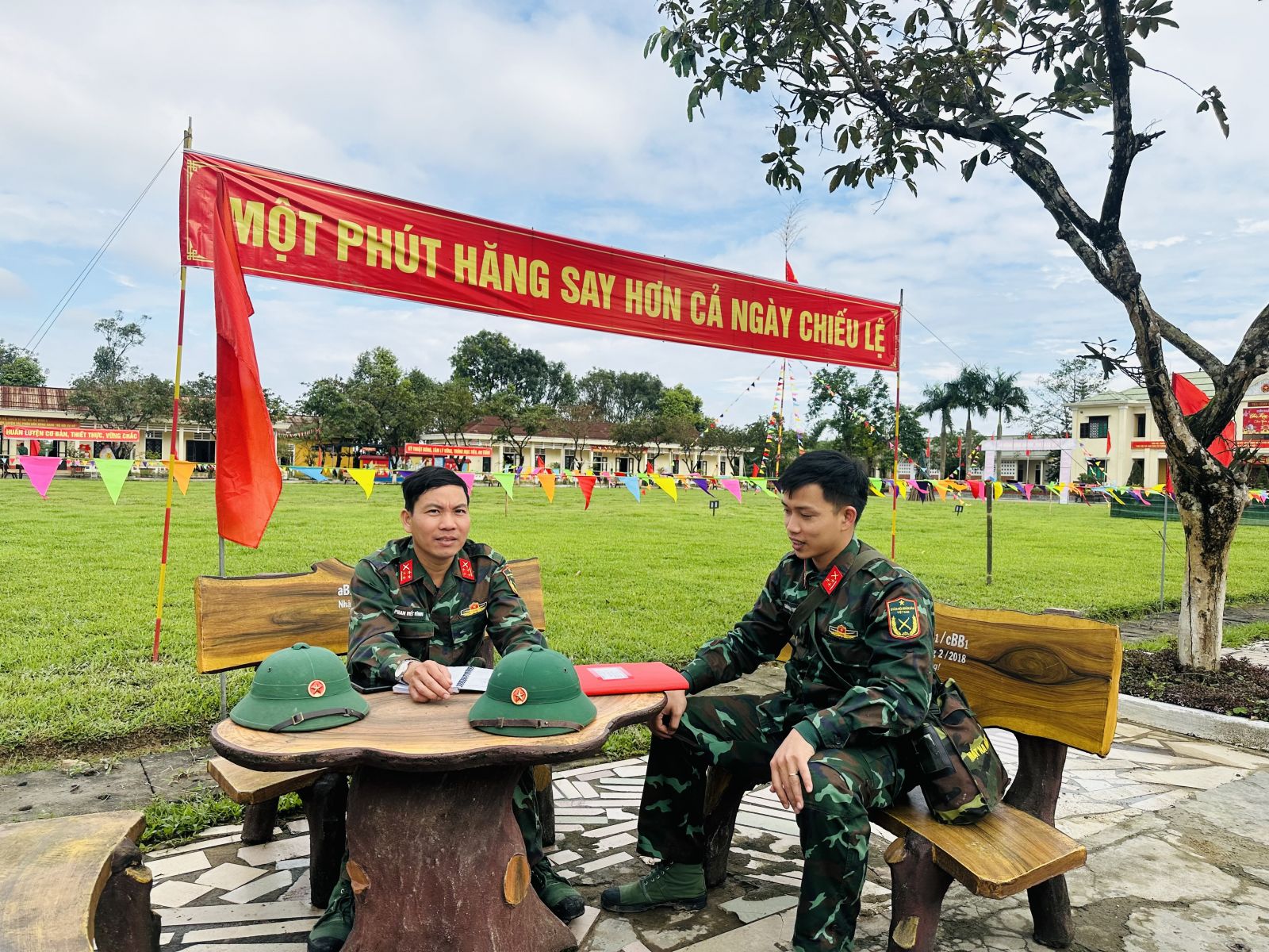 Vừa hoàn thành buổi báo động sẵn sàng chiến đấu, cất ba lô, súng và những quân tư trang về vị trí, Đại úy Phan Viết Vĩnh cùng đồng đội ngồi nghỉ chân nơi ghế đá đơn vị.