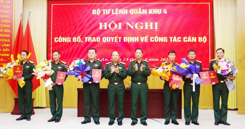| Lãnh đạo Quân khu 4 tặng hoa, chúc mừng các cán bộ được điều động, bổ nhiệm |