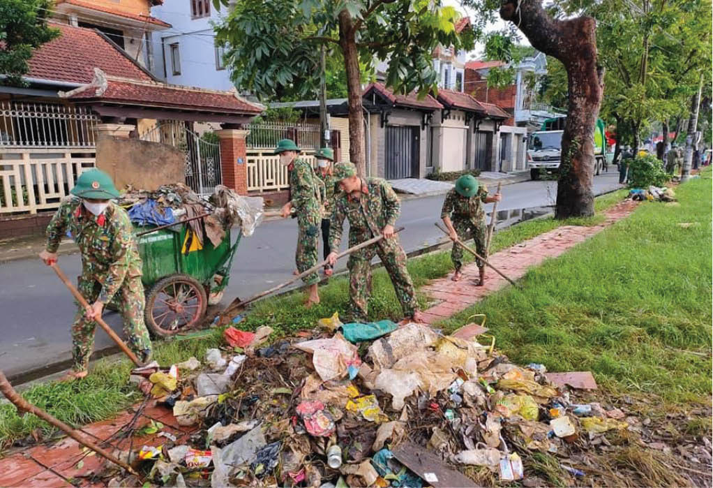 Sau lụt, bão, những con đường ở TP. Huế ngổn ngang rác thải, gây nguy cơ ô nhiễm môi trường nghiêm trọng. Khi nước rút, bão tan, những người lính đã kịp thời có mặt cùng tham gia dọn bùn, rác thải, trả lại cảnh quan môi trường, giúp các phương tiện lưu thông thuận tiện hơn.