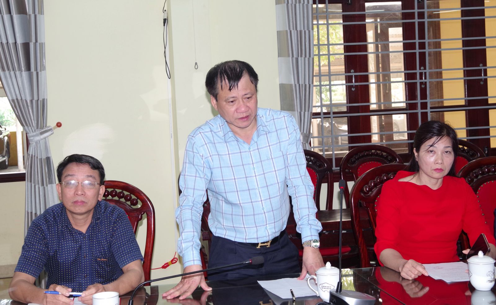 Thân nhân gia đình liệt sĩ Mai Thế Diềm trao đổi thông tin với các cơ quan, đơn vị