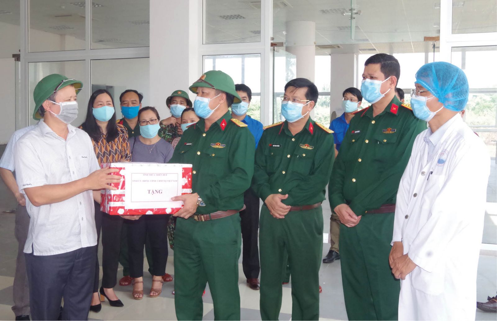 Bí thư Tỉnh ủy Lê Trường Lưu (ngoài cùng bên trái) thăm, tặng quà động viên lực lượng vũ trang phục vụ tại các khu cách ly phòng chống COVID - 19