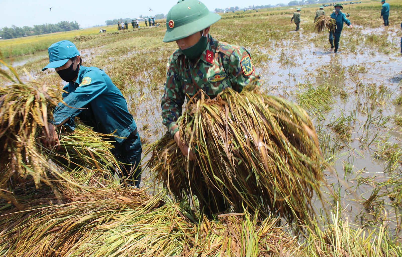 Lực lượng vũ trang giúp dân gặt lúa chạy lũ