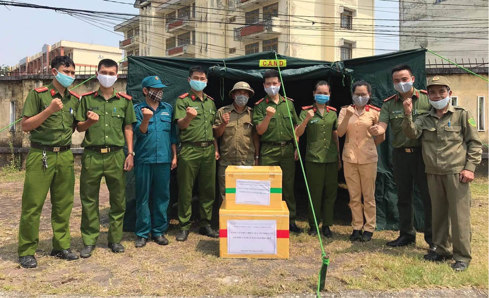 Đại úy Nguyễn Tuấn Anh (thứ 2 từ phải sang) cùng chi đoàn các đơn vị tham gia tặng quà các chốt kiểm soát dịch