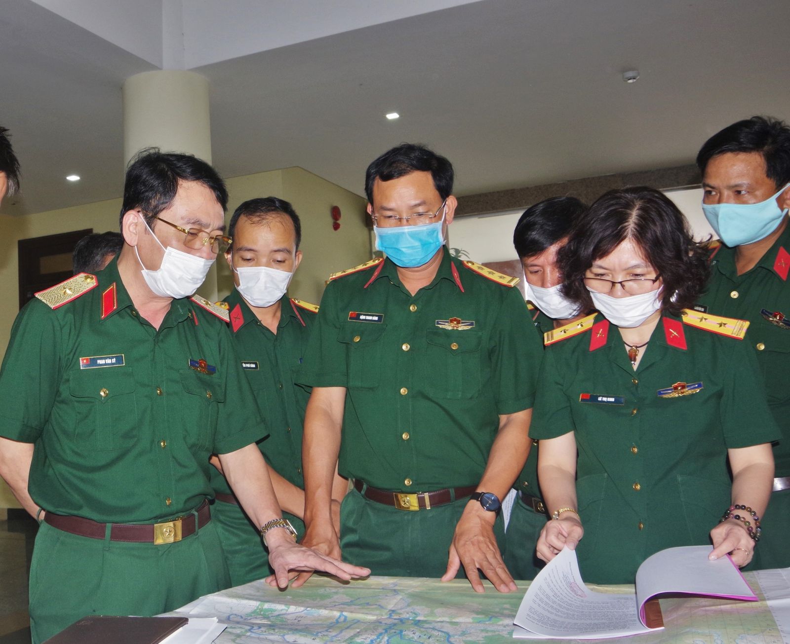 Thiếu tướng Phan Văn Sỹ, Phó Chủ nhiệm Chính trị, Phó trưởng ban chỉ đạo 515 Quân khu 4 (bên trái) kiểm tra công tác lập bản đồ của các địa phương