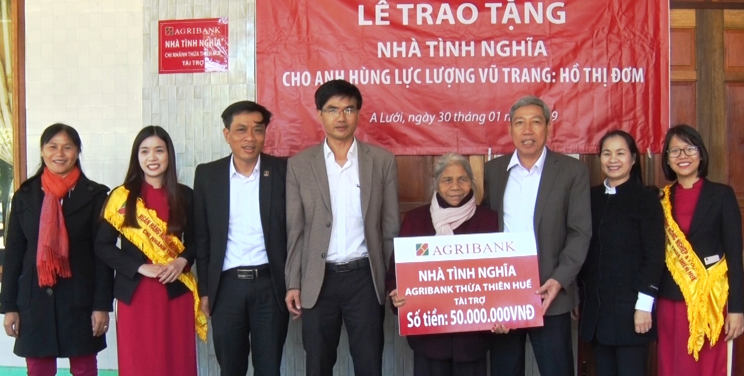 HNN.VN - Ngày 30/1, AgriBank chi nhánh tỉnh tặng 50 suất quà (1 triệu đồng/suất) cho các hộ nghèo, gia đình chính sách và 50 triệu đồng tiền tài trợ nhà tình nghĩa cho Anh hùng lực lượng vũ trang Hồ Thị Đơm, xã A Ngo, huyện A Lưới.