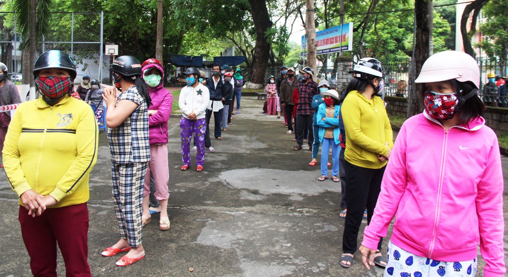 Từ sáng sớm, rất đông người dân có hoàn cảnh khó khăn, đa số lao động chân tay, đạp xích lô, lượm ve chai, bán vé số… xếp hàng dài tại các điểm đặt máy “ATM gạo”. Ở mỗi điểm, lực lượng chức năng cũng bố trí cán bộ hướng dẫn người dân đứng giãn cách để đảm bảo an toàn theo những chỉ dẫn được đánh dấu trước đó.
