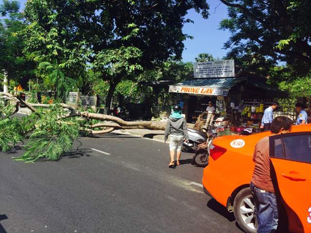 | Cây xanh bật gốc chắn ngang đường Trần Hưng Đạo. Ảnh: NTH |