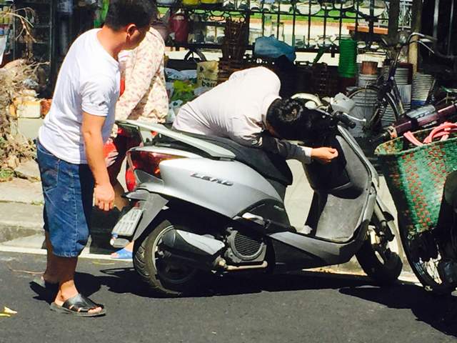| Người dân dựng xe chị Đào lên và đưa chị đi cấp cứu. Ảnh: NTH |