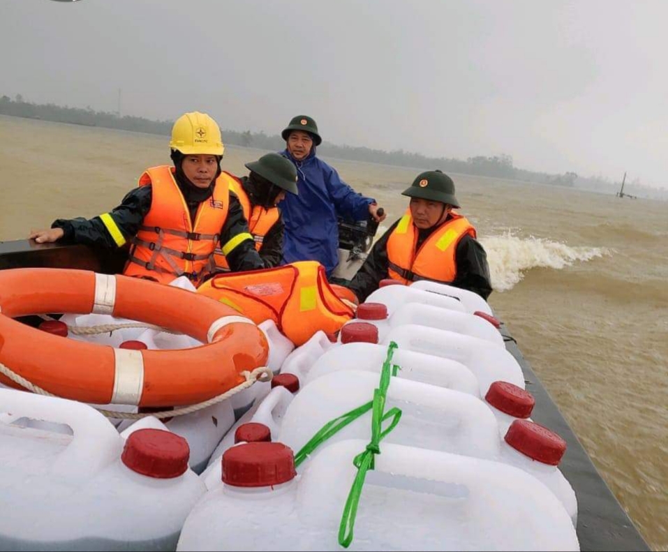 Nhân viên kỹ thuật Viettel vận chuyển nhiên liệu đến các nhà trạm trong mưa lũ