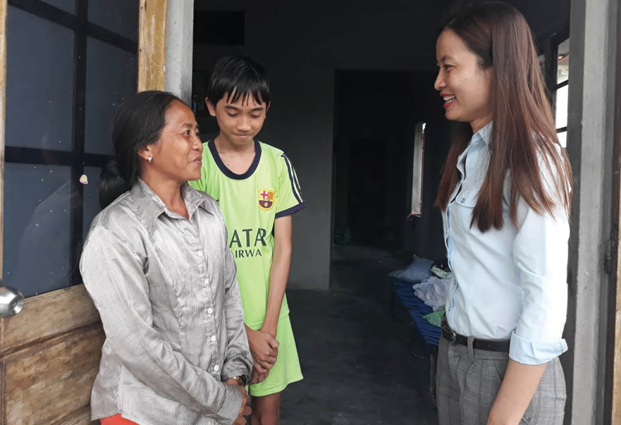 Chị Thủy (phải) thăm hỏi các thành viên gia đình ông Huỳnh Tồn