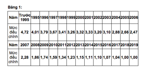 Trong đó, mức điều chỉnh tiền lương đã đóng bảo hiểm xã hội của năm tương ứng được thực hiện theo Bảng 1 dưới đây: