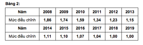 Trong đó, mức điều chỉnh thu nhập tháng đã đóng bảo hiểm xã hội của năm tương ứng được thực hiện theo Bảng 2 dưới đây: