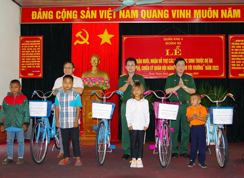 Tại lễ nhận nuôi, hỗ trợ các cháu học sinh, Đoàn 92 đã trao xe đạp, bàn học, đèn, cặp, sách, vở, áo mưa, chăn, gạo, nhu yếu phẩm, tiền mặt…cho các cháu nhận nuôi, nhận hỗ trợ.