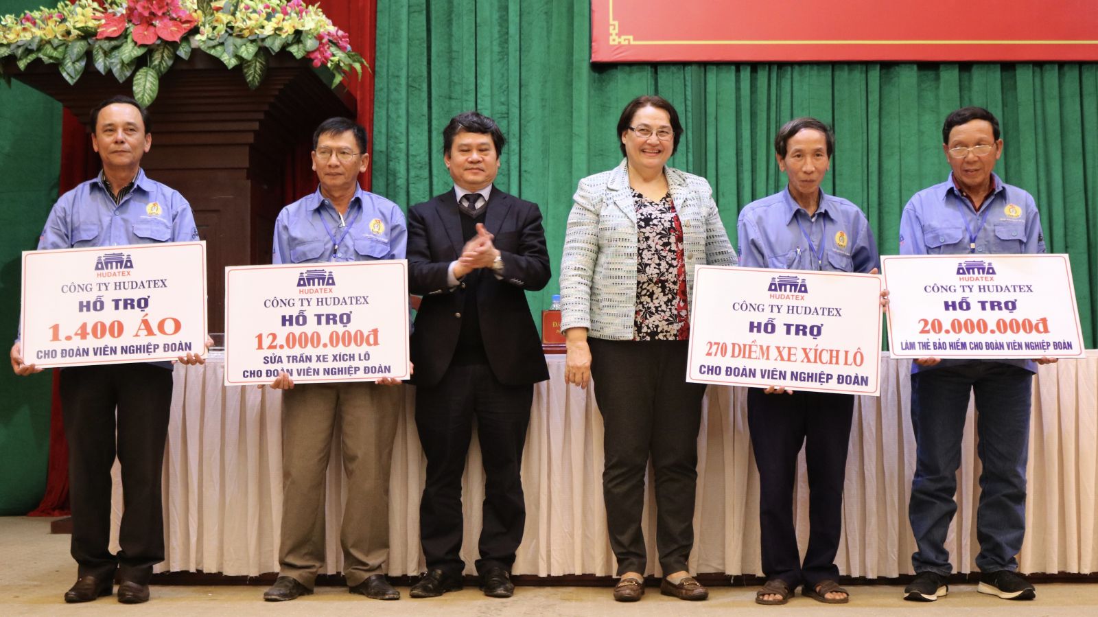Trao các phần quà do doanh nghiệp tài trợ đến đoàn viên