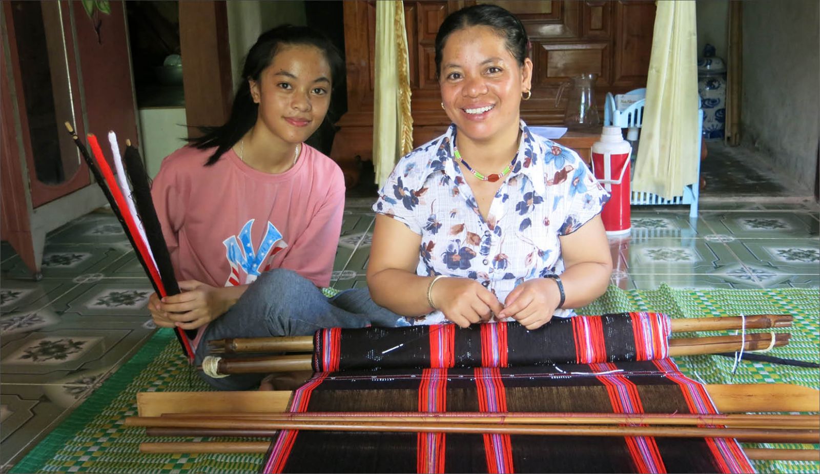 Mẹ con chị Trần Thị Hinh hạnh phúc với công việc dệt zèng