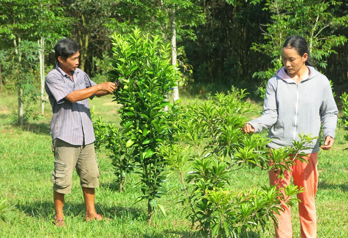 Vợ chồng anh Sơn, chị Phương chăm sóc vườn cây ăn quả