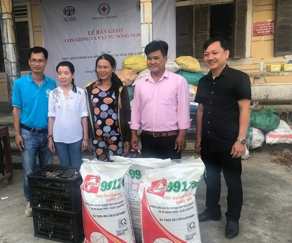 Đại diện ADRA- Hoa Kỳ tại Thừa Thiên Huế trực tiếp hỗ trợ giống gà và thức ăn cho bà con ở huyện Quảng Điền