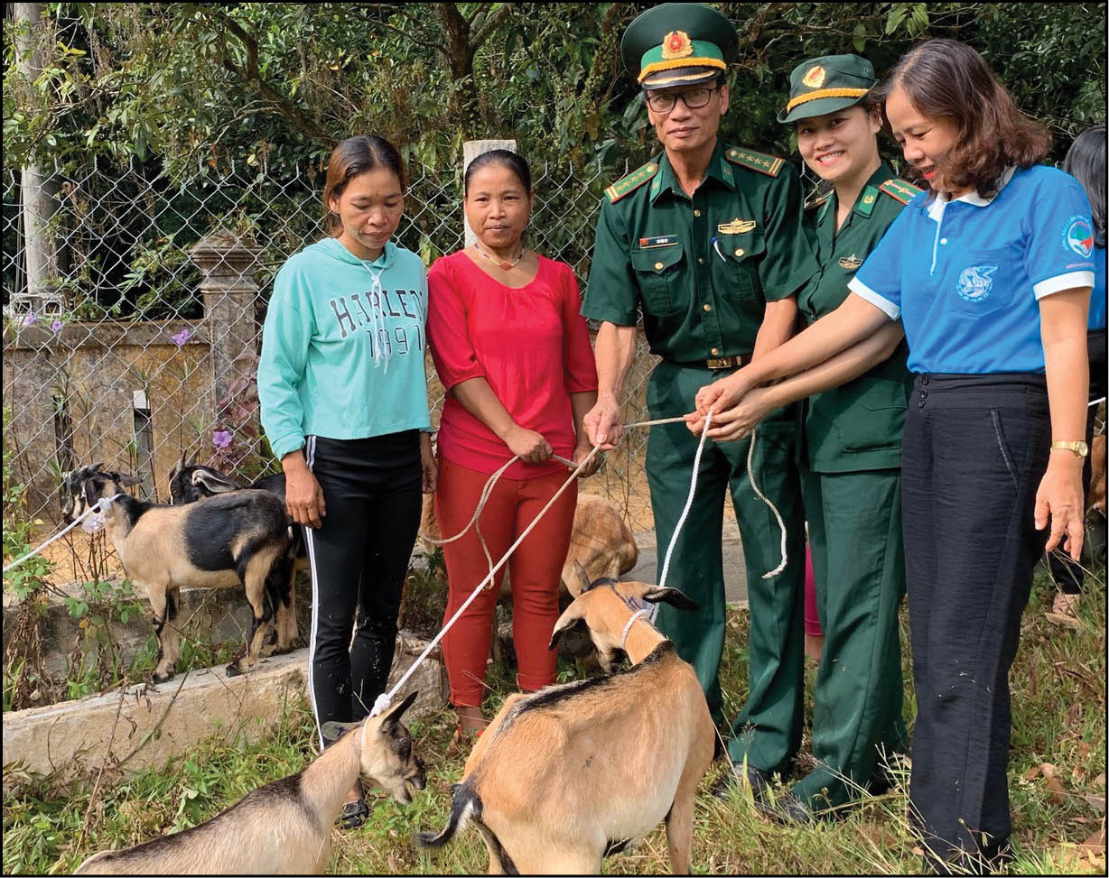 Thiếu tá Trần Thị Nam Phương (thứ 2 từ phải sang) trao dê giống giúp phụ nữ A Lưới thoát nghèo