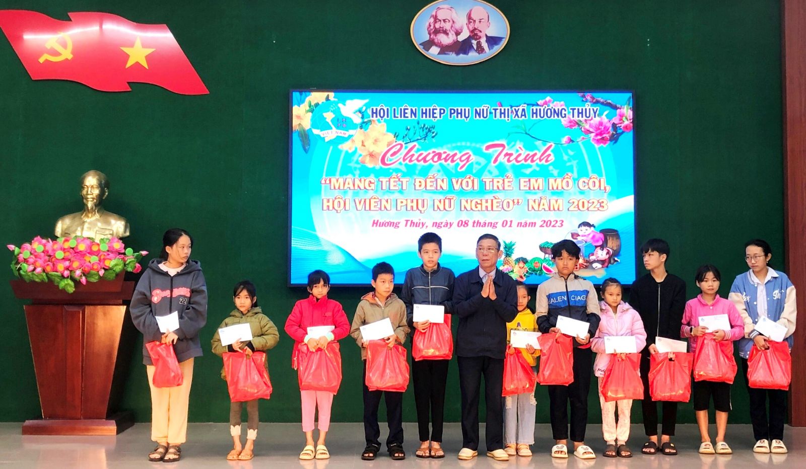 HNN.VN - Chương trình “Mang Tết đến với trẻ mồ côi, hội viên phụ nữ nghèo” trên địa bàn TX. Hương Thủy diễn ra sáng 8/1. Hoạt động do Hội LHPN thị xã tổ chức, góp phần giúp những người có hoàn cảnh khó khăn đón Tết Nguyên đán Quý Mão 2023 vui tươi, ấm áp hơn.