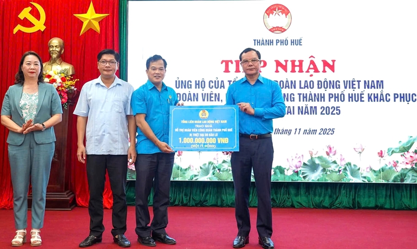 Thay mặt Tổng LĐLĐ Việt Nam, ông Nguyễn Đình Khang trao biển tượng trưng 1 tỷ đồng hỗ trợ đoàn viên, NLĐ TP. Huế bị ảnh hưởng mưa lũ. Dịp này, Báo Tuổi Trẻ cũng trao biển tượng trưng 500 triệu đồng, đồng hành cùng tổ chức Công đoàn trong công tác hỗ trợ, tiếp sức NLĐ vùng lũ.