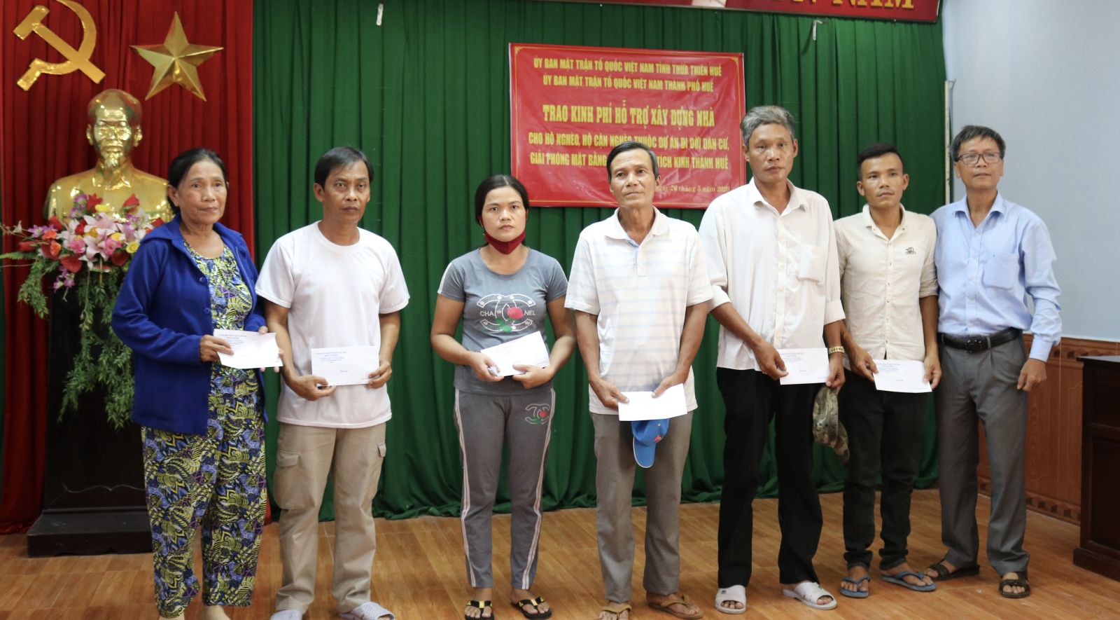 Chủ tịch Ủy ban MTTQVN TP. Huế Hoàng Viết Thắng (ngoài cùng, bên phải) trao tiền hỗ trợ xây nhà cho các hộ nghèo, cận nghèo thuộc dự án di dân