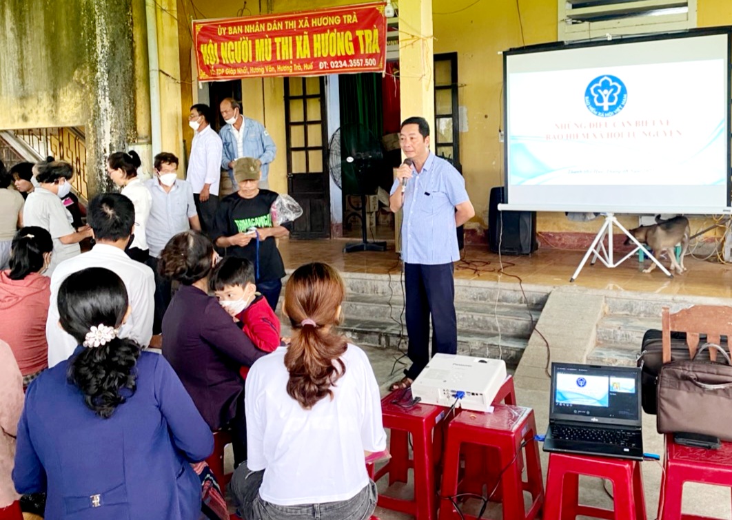 Cùng ngày, BHXH TX. Hương Trà đã phối hợp với Công ty CP Đào tạo bảo hiểm An sinh Thừa Thiên Huế tổ chức buổi tuyên truyền chính sách BHXH tự nguyện, BHYT hộ gia đình cho hơn 100 hội viên Hội người mù TX. Hương Trà.